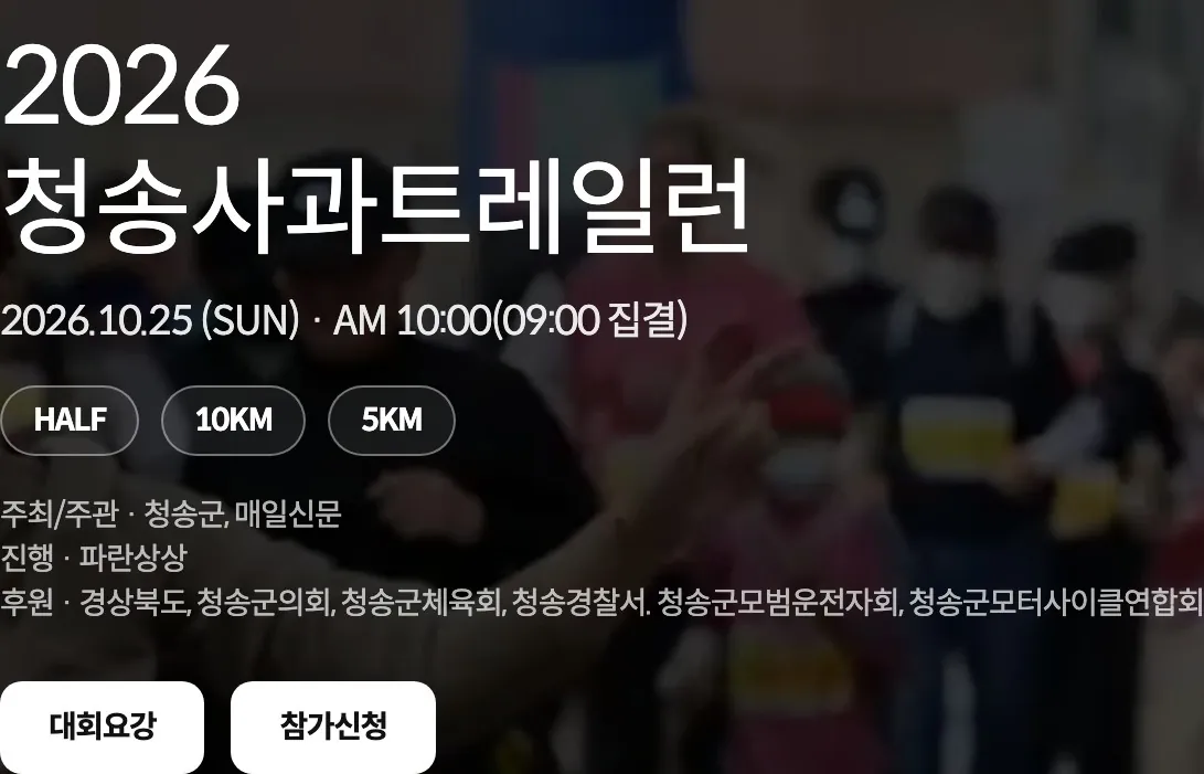 2026 청송사과 트레일런 대회 안내해 드리겠습니다. 2026년 청송사과 트레일런 대회가 10월 25일 개최됩니다. 대회 신청, 대회 코스, 대회 기념품, 대회 일정, 기록 조회, 환불 등 자세히 알아보겠습니다.