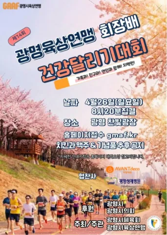 2026 광명 치맥런 대회 안내해 드리겠습니다. 2026년 광명시육상연맹 회장배 건강달리기대회가 4월 26일 개최됩니다. 대회 신청, 대회 코스, 대회 기념품, 대회 일정, 기록 조회 등 이 대회에 대해서 알아보겠습니다.