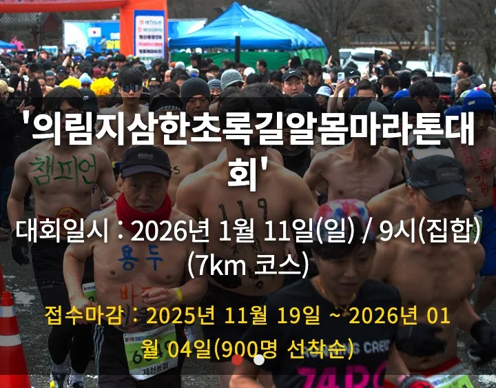 2026 제천의림지 삼한초록길 알몸마라톤 대회 안내해 드리겠습니다. 2026년 제천의림지 알몸마라톤 대회가 1월 11일 개최됩니다. 대회 신청, 대회 코스, 대회 기념품, 대회 일정, 기록 조회, 환불 등 자세히 알아보겠습니다.