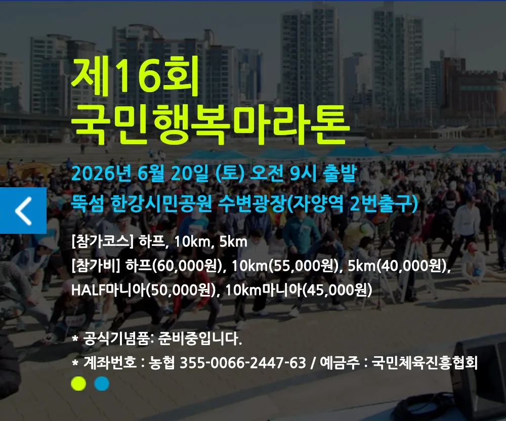 2026 국민행복마라톤 대회 안내해 드리겠습니다. 2026년 제 16회 국민 행복 마라톤 대회가 6월 20일 개최됩니다. 대회 신청, 대회 코스, 대회 기념품, 대회 일정, 기록 조회, 환불등 이 대회에 대해서 알아보겠습니다.