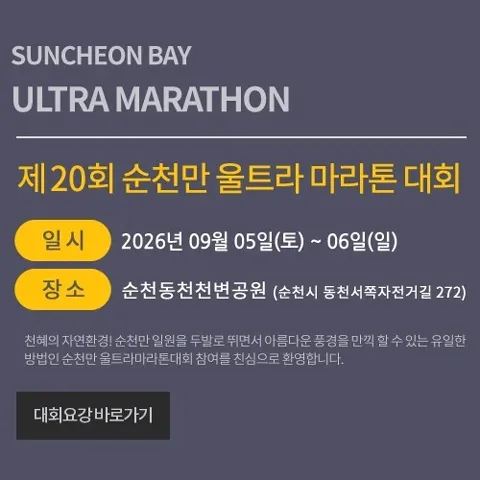 2026 순천만울트라마라톤 대회 안내해 드리겠습니다. 2026년 제20회 순천만 울트라 마라톤 대회가 9월 5일 개최됩니다. 대회 신청, 대회 코스, 대회 기념품, 대회 일정, 기록 조회, 환불 등 자세히 알아보겠습니다.